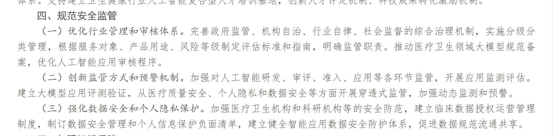 (二)創新監管方式和預警機制。加強對人工智能研發、審評、準入、應用等各環節監管,開展應用監測評估。建立大模型應用評測驗證,從醫療質量安全、個人隱私和數據